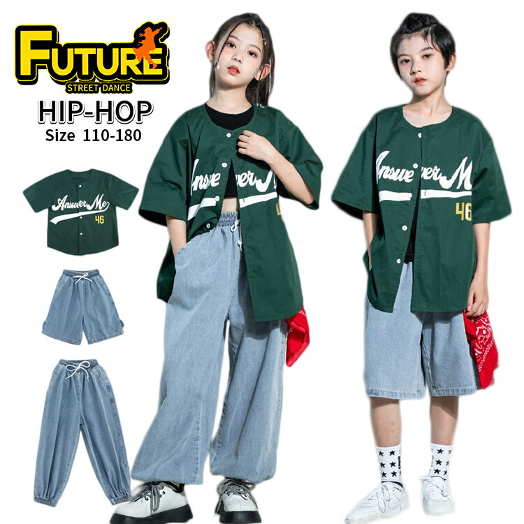 ベースボールシャツ ダンス衣装 ヒップホップ 緑 キッズ セットアップ 女の子 男の子 野球服 デニムパンツ ハーフパンツ 韓国 k-pop衣装 ジャズダンス 半袖 ワイドパンツ 男女兼用 機能風