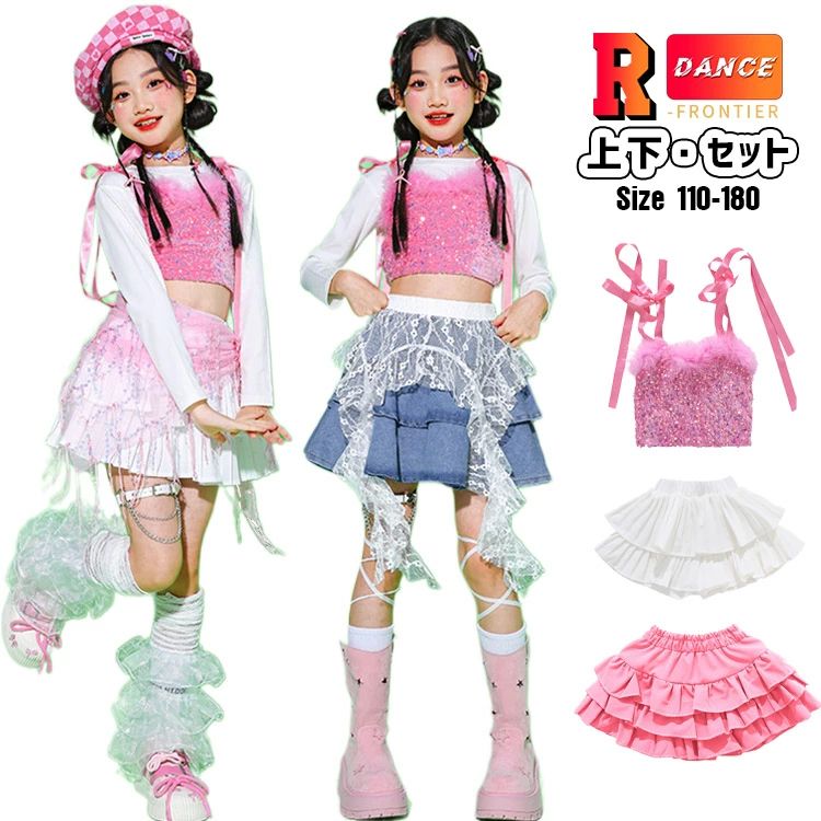 キッズ ダンス 衣装 へそ出し トップス 女の子 セットアップ 白 スカート デニムスカート ピンク キラキラ タンクトップ スパンコール ジャズダンス k-pop衣装 アイドル風 ガ 韓国