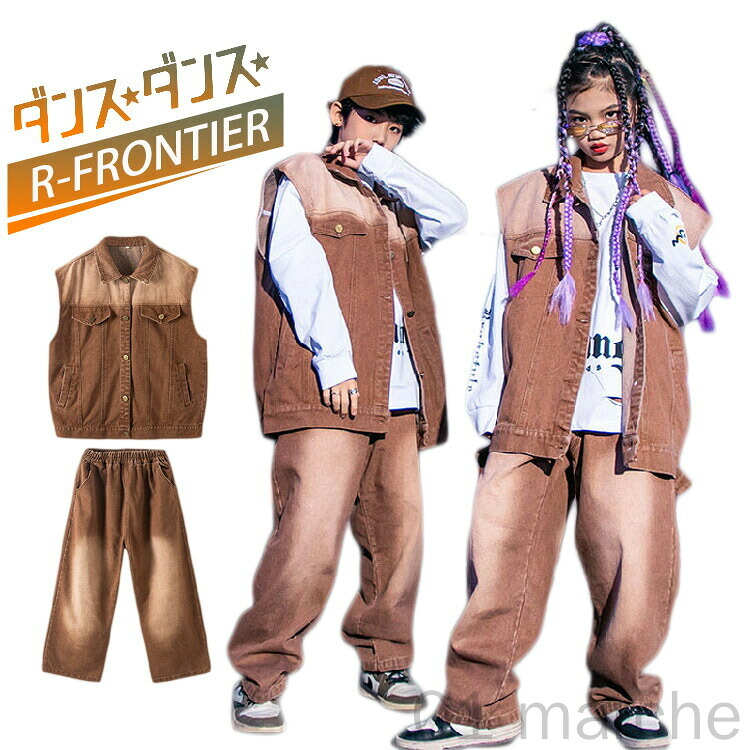 ダンス衣装 ベスト キッズ デニム 茶色 女の子 男の子 ヒップホップ セットアップ デニムパンツ 韓国 k-pop衣装 ジャズダンス グラデーション 子供 ワイドパンツ ゆったり 袖なし かっこいい