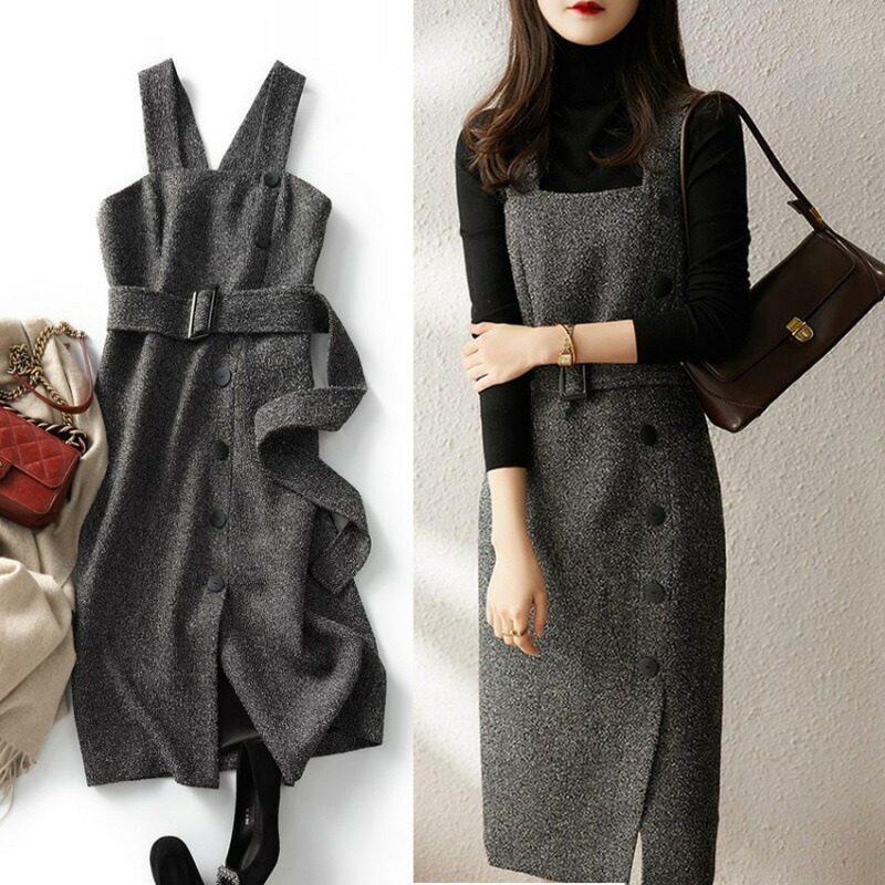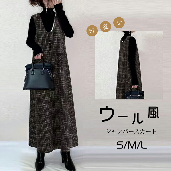 ジャンパースカート ロング丈 ノースリブ ウール風 ウール調 チェック柄 Aライン 秋冬 無地 深Vネック 重ね着 レイヤード ジャンスカ きれいめ カジュアル 着痩せ効果 体型カバー 雰 フォーマル