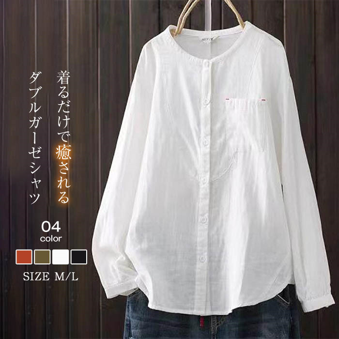 ガーゼ シャツ レディース 長袖 ノーカラー 2重ガーゼ シャツブラウス トップス 春 夏 秋 冬 カジュアル ナチュラル ダブルガーゼ 羽織り 白シャツ 体型カバー 通勤