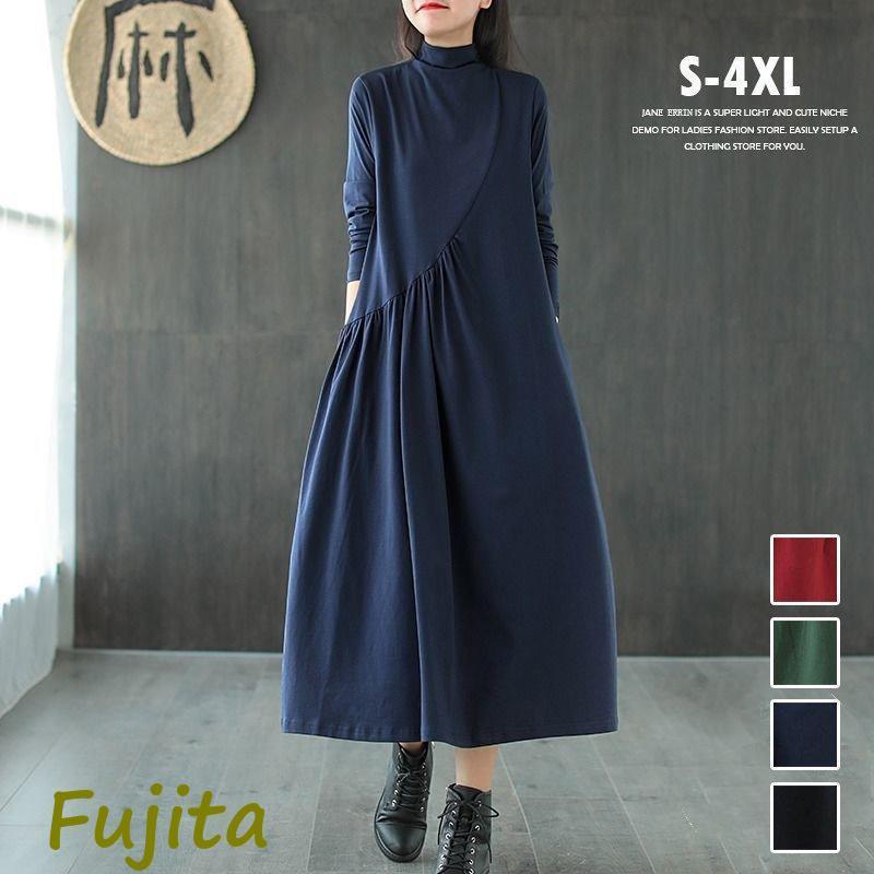ワンピース 長袖 ロングワンピース タートルネック レディース 体型カバー フレア 通勤 オフィス ミモレ丈 ブラック 秋 冬 黒