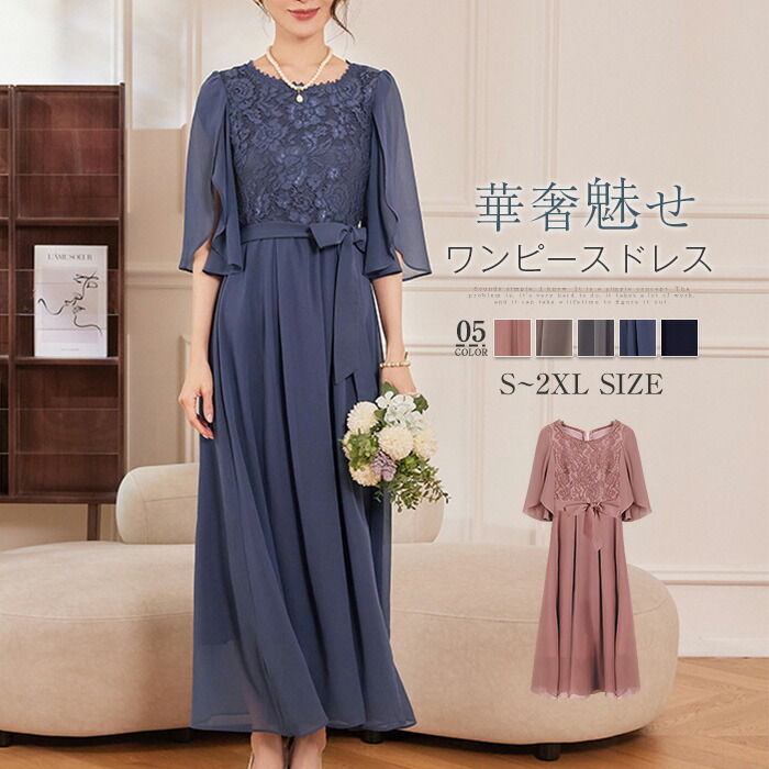 ワンピース ドレス 結婚式 レディース ロングワンピース ワンピースドレス 五分袖 レース ロング丈 フォーマルドレス パーティードレス フォーマル 大きいサイズ 体型カバー 上品 春 秋 冬 シ 夏