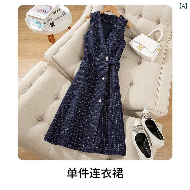 ツイード ドレス 女性用 スリム ウール ベスト スカート レディース 秋冬 エレガントの スタイル 2024 チェック 柄 ボトム ノースリーブ
