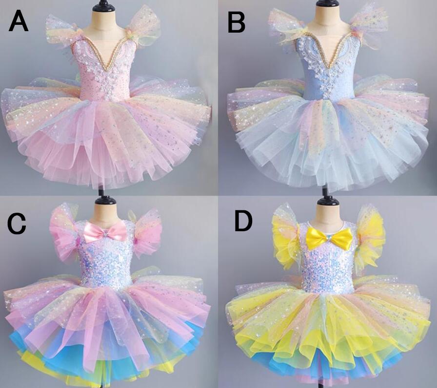 バレエ ダンス衣装 子供 レオタード スパンコール リボン お嬢風ドレス 虹柄スカート ジュニア プリンセス 子どもレッスン