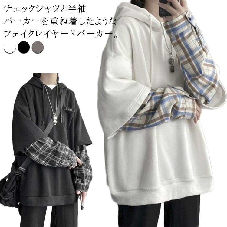 重ね着 パーカー メンズ レディース フェイクレイヤード ビッグ