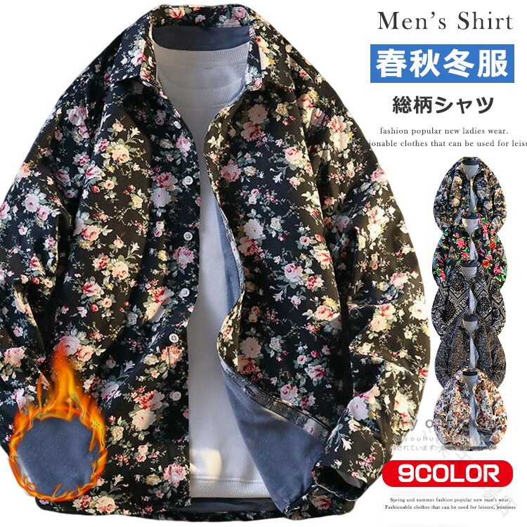厚手長袖シャツ メンズ裏起毛カジュアルシャツ 暖かい花柄アロハシャツ シャツジャケット カジュアルコーデ秋冬服 父の日敬老の日プレゼント対応 オシャレトップス 冬物きれいめスリムシャツ