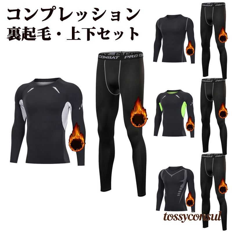 コンプレッション 裏起毛 上下セット ウェア メンズ 長袖 シャツ + ハーフ ロング パンツ 2点セット スポーツウェア トレーニングウェア アンダーシャツ タイツ 長袖丸首 コンプレッションウェア