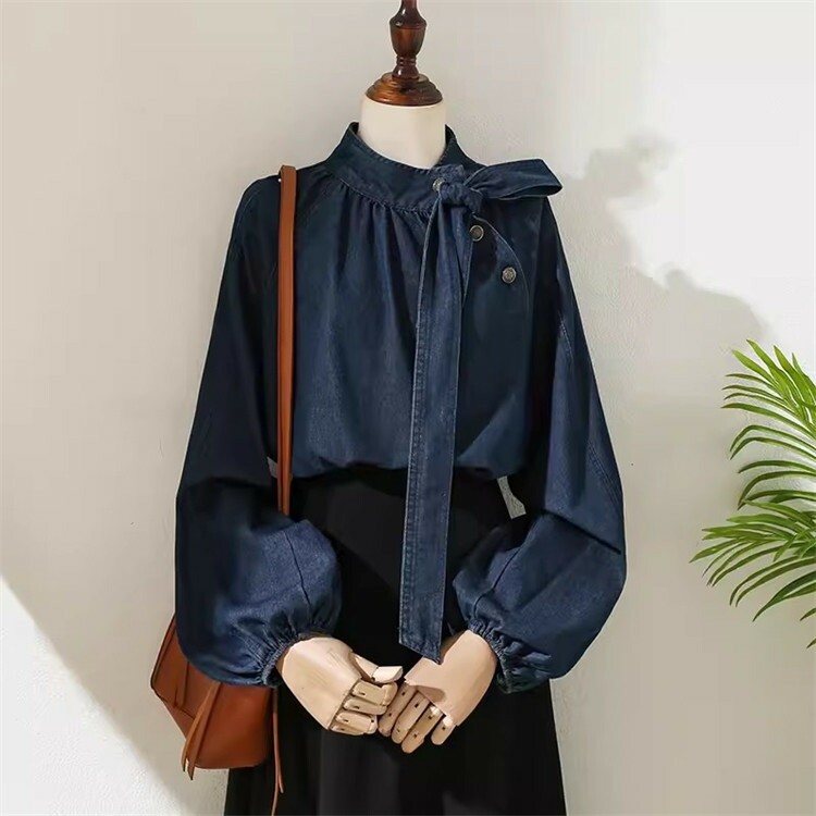 ブラウス シャツブラウス レディース リボン デニム ブラウス トップス シャツ 長袖 スタンドカラー ボウタイ ハイネック