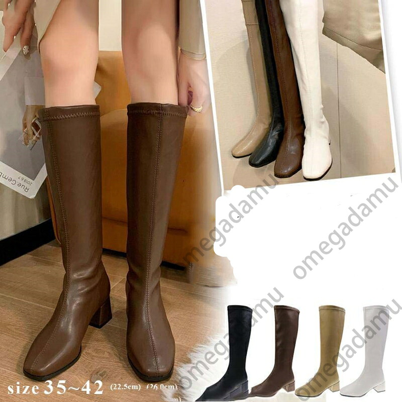 ロングブーツ レディース スクエアトゥ ロング丈 太めヒール ストレッチ 白ブーツ